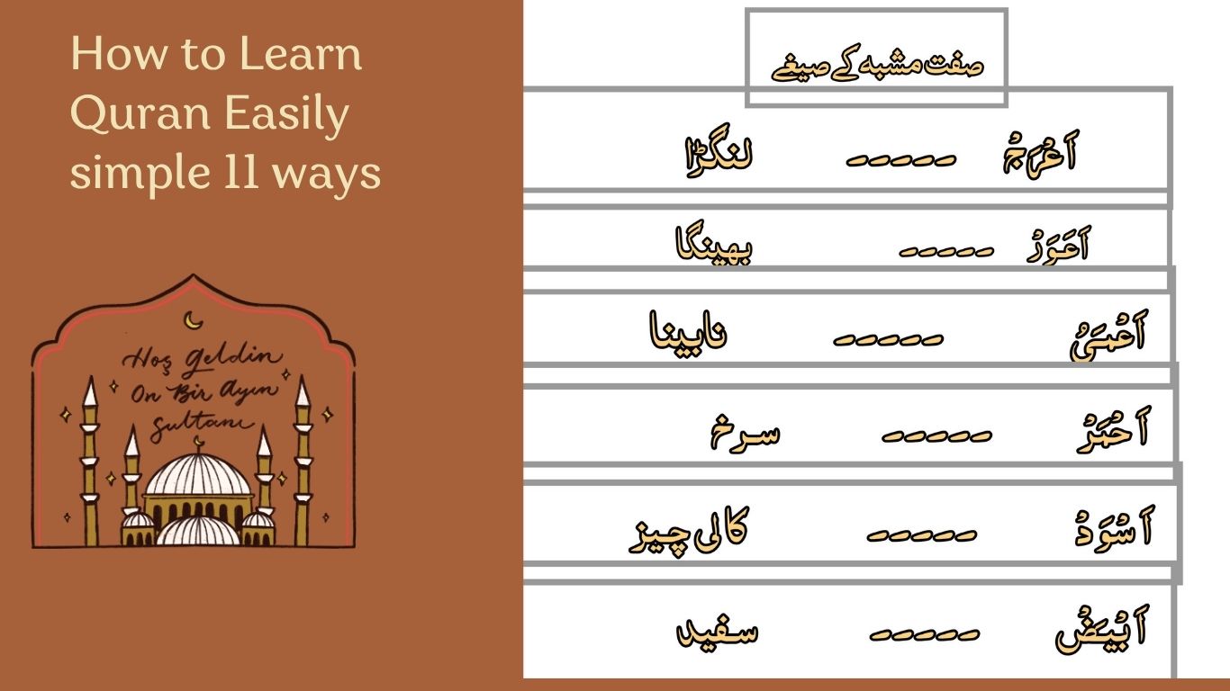 How to Learn Quran Easily simple 11 way”۔       اب آپ کے لئے اگلا سبق تیار کیا ہے جس میں ہم پڑھیں   گے “صفت مشبہ کے صیغے”  آپ کی آسانی کے لئے  اس سبق کو خوبصورت جدول اور مشق کی صورت میں تیار  کیا ھے  تاکہ صفات، اوزان، اور مثالیں آسانی سے یاد ہو جائیں۔ اس سے یادداشت اور بھی مضبوط ہو جائے گی۔،